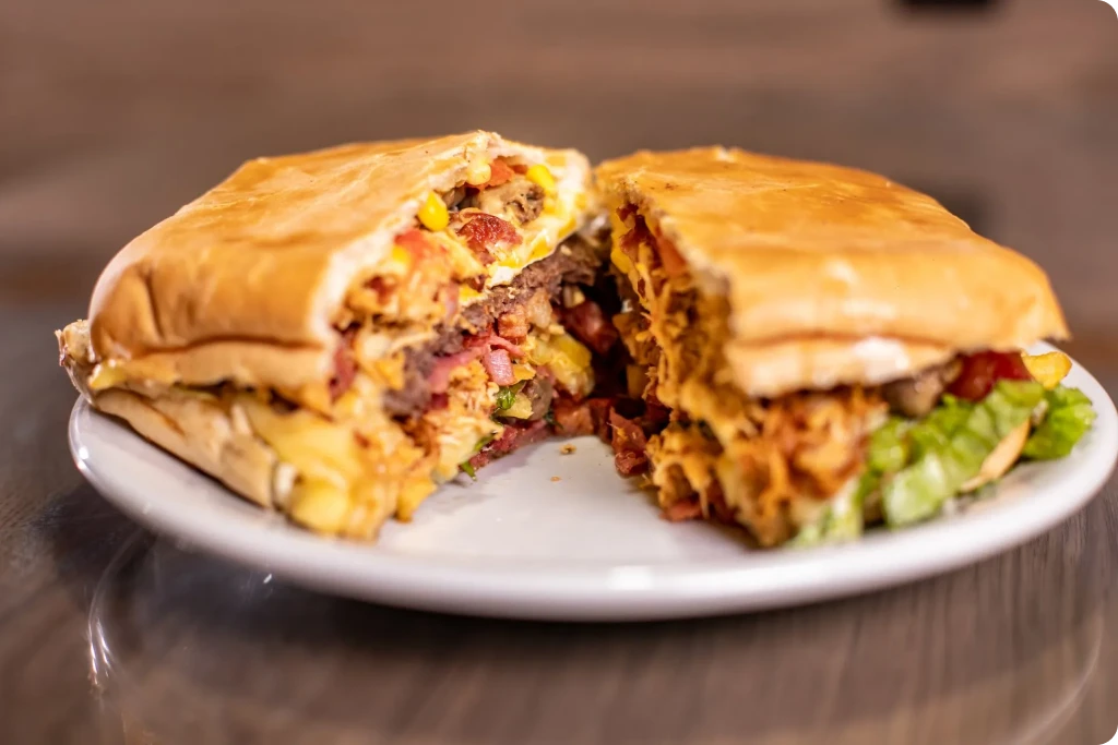 Pão salgado, bife, maionese mama's, queijo, tomate, alface, milho, fritas e ovo.