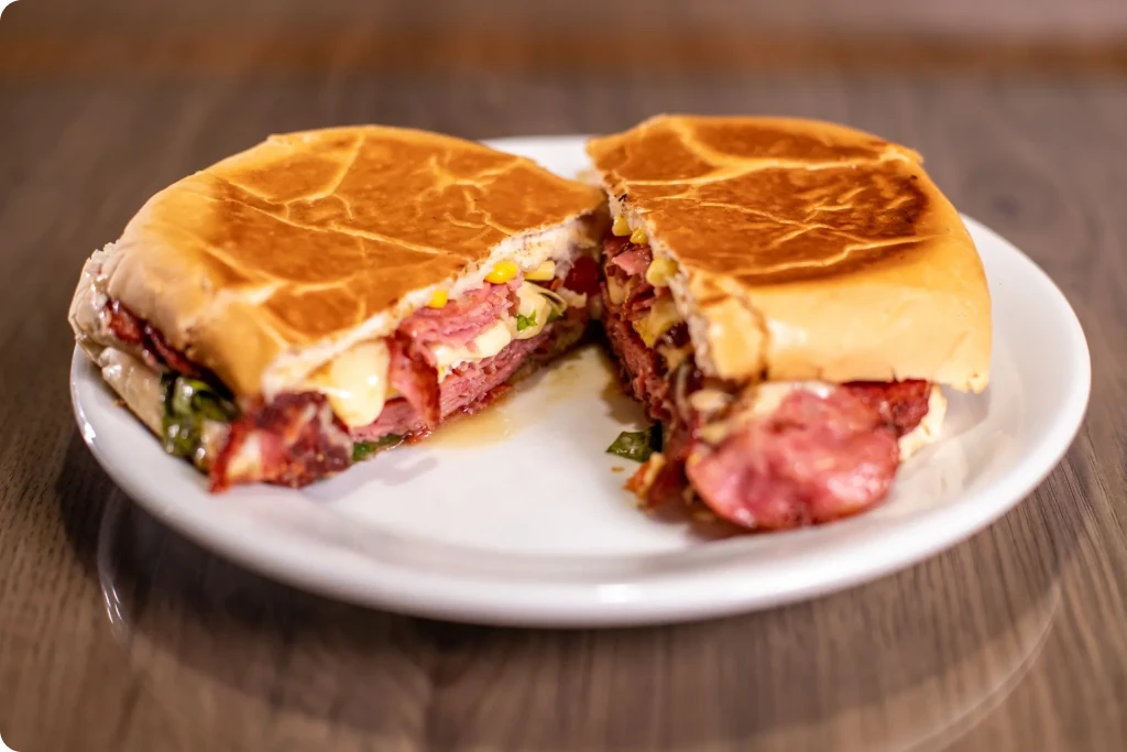 Pão salgado, calabresa, maionese mama's, queijo, alface, milho, fritas e ovo.