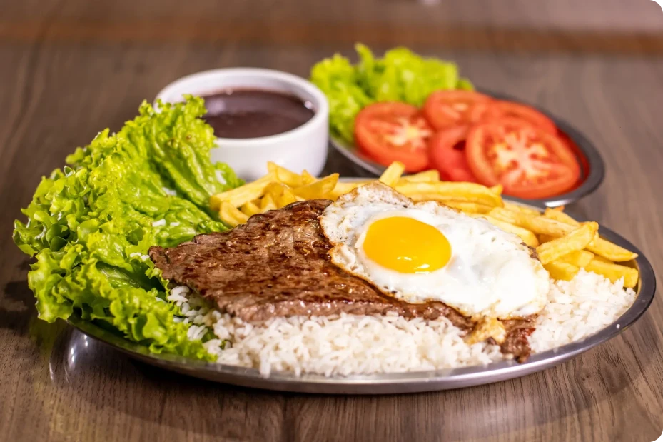 Bife a parmegiana, arroz, fritas, dois ovos, feijão